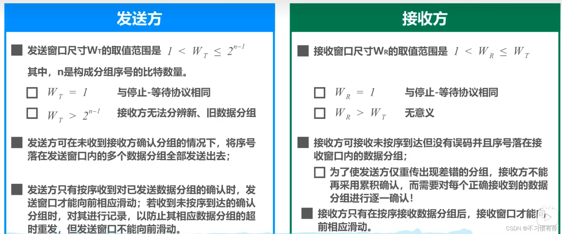 注意:选择重传协议是为了是发送方仅重传出现差错的分组,接收方不能再采用累积确认,而需要对每个正确接收到的数据进行逐一确认。