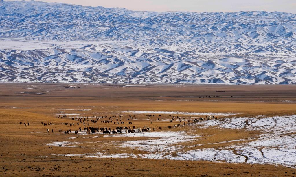 11月4日,羊群在新疆裕民县巴尔鲁克山冬季牧场上觅食。新华社发(陈双喜 摄)