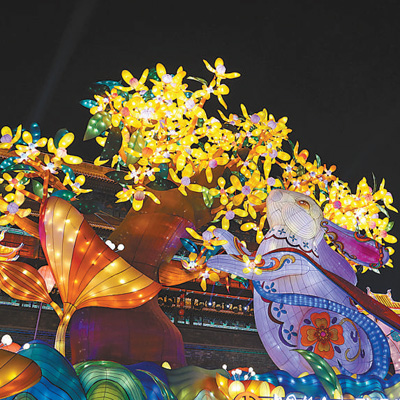 走进城墙永宁门,首先迎接游人的便是高约18米的“月中桂兔”灯组:一只玉兔挺起身子,把桂树轻嗅,憨态可掬,惹人怜爱。