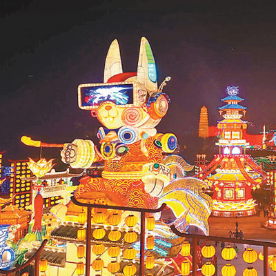 陕西西安城墙灯会,“月中桂兔”灯组绚丽多彩。