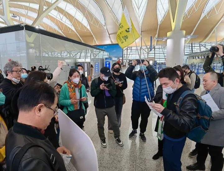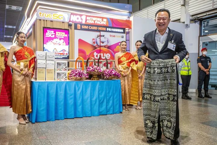 疫情前多次带团来泰国的领队谭明远一边挥舞旗子,一边招呼团队游客合影。“很开心再次踏入这个微笑国度。”他说,从出关到入境,整个行程十分顺畅,下机后的欢迎仪式让他感受到当地人满满的热情。