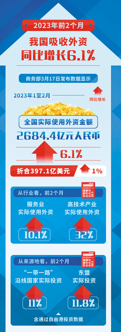 数据显示,今年1-2月,全国实际使用外资金额2684.4亿元人民币,同比增长6.1%。