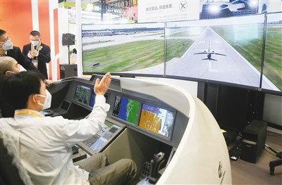 第五届进博会技术装备展区霍尼韦尔展台,参观者在工作人员指导下体验模拟飞行。