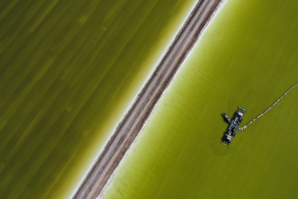 2022年4月1日,采盐船在青海盐湖工业股份有限公司钾肥分公司的盐湖工作。新华社记者张龙摄