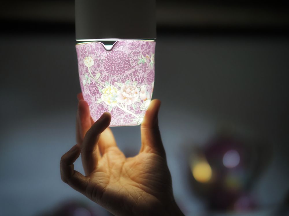 4月18日,在江西省景德镇古窑民俗博览区,非遗传承人罗细堂展示通透的瓷杯。新华社记者赵宇摄