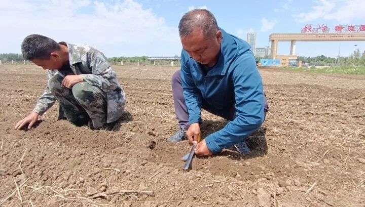 姜文野(右)在田间测量垄宽。(受访者供图)