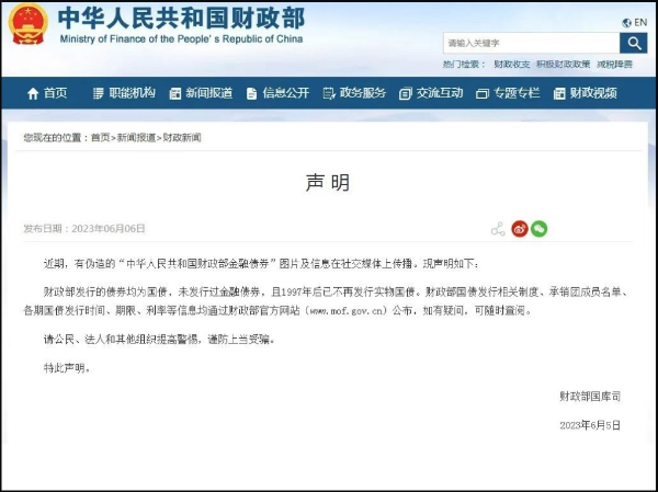 真相:近期,有伪造的“中华人民共和国财政部金融债券”图片及信息在社交媒体上传播。对此,财政部国库司发布声明指出,财政部发行的债券均为国债,未发行过金融债券,且1997年后已不再发行实物国债。财政部国债发行相关制度、承销团成员名单、各期国债发行时间、期限、利率等信息均通过财政部官方网站公布,如有疑问,可随时查阅。(来源:财政部官方网站)