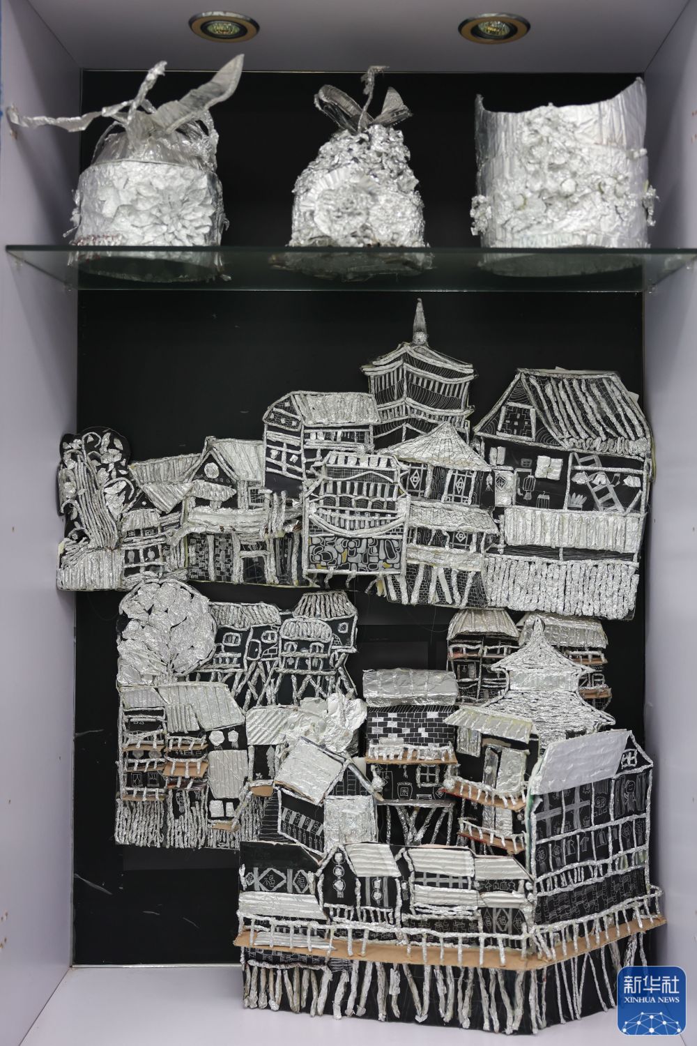 ↑这是6月9日在湖南省长沙市朝阳小学拍摄的有苗族银饰特色的学生手工作品。