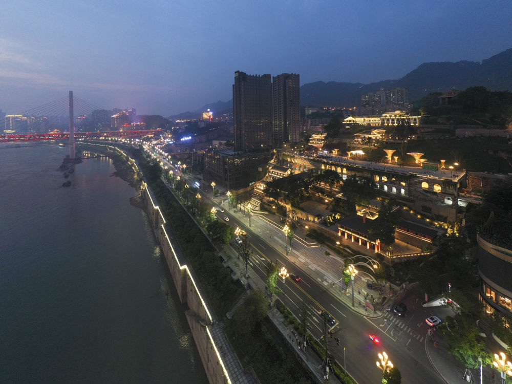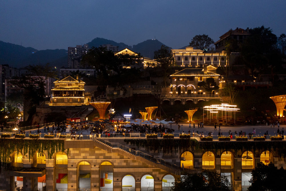 6月9日拍摄的重庆南岸区南滨路上的重庆开埠遗址公园夜景(无人机照片)。