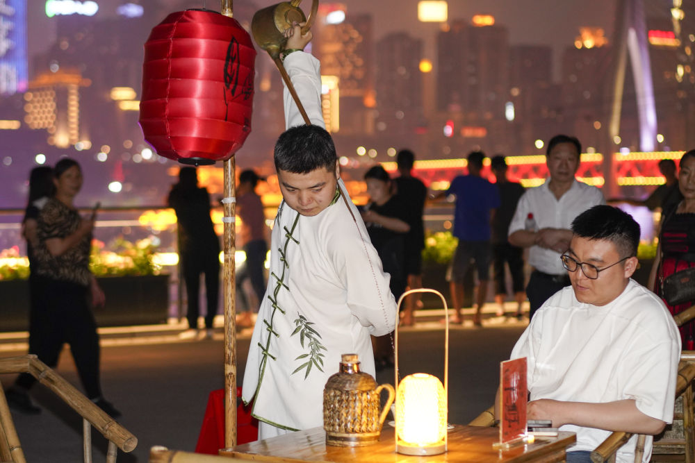 6月9日,重庆开埠遗址公园的观景平台上,游客们在一边欣赏重庆夜景,一边感受茶艺表演。