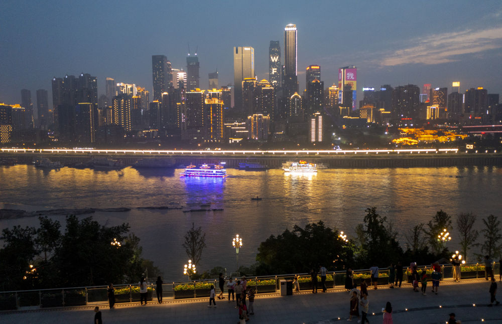 6月9日,重庆开埠遗址公园的观景平台上,游客们在欣赏重庆夜景(无人机照片)。