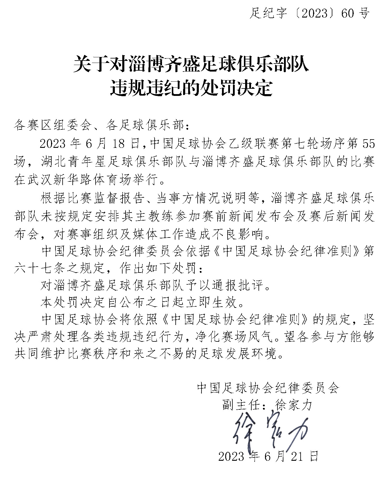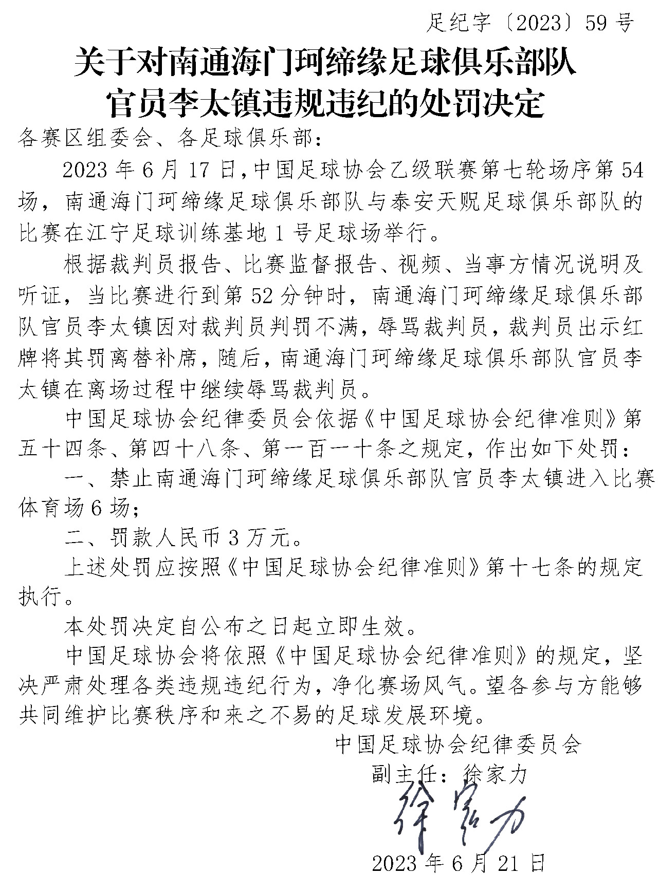 据中国足球协会网站消息,日前中国足协就福建泉州青工足球俱乐部队球员许琦、淄博齐盛足球俱乐部队和南通海门珂缔缘足球俱乐部队官员李太镇违规违纪作出处罚决定,具体内容如下。