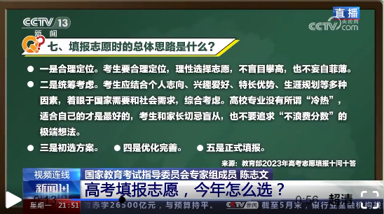国家教育考试指导委员会专家组成员 陈志文:①各级政府的服务意识在加强。今年教育部首次公布关于志愿填报的十问十答,它几乎是从志愿填报的ABC开始做起。此外还有从2003年一直做到现在的,基于阳光高招平台做的志愿填报在线问答,有文字、视频。②各地考试院都以各种形式,以线上、线下的方式在做服务。③还有高校的服务意识,以前高校招生宣传服务主要是招办主任,后来有个别的主管副校长。今年,一把手校长走到学校的招生宣传或者招生服务一线。