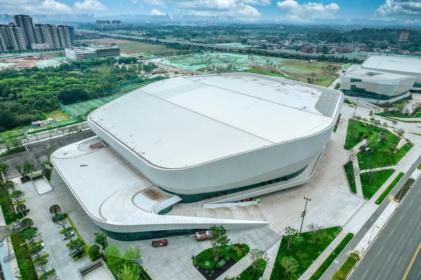 高新体育中心体育馆是大运会乒乓球项目比赛、热身场馆,外观设计灵感来源于蜀锦,兼具流畅与灵动。