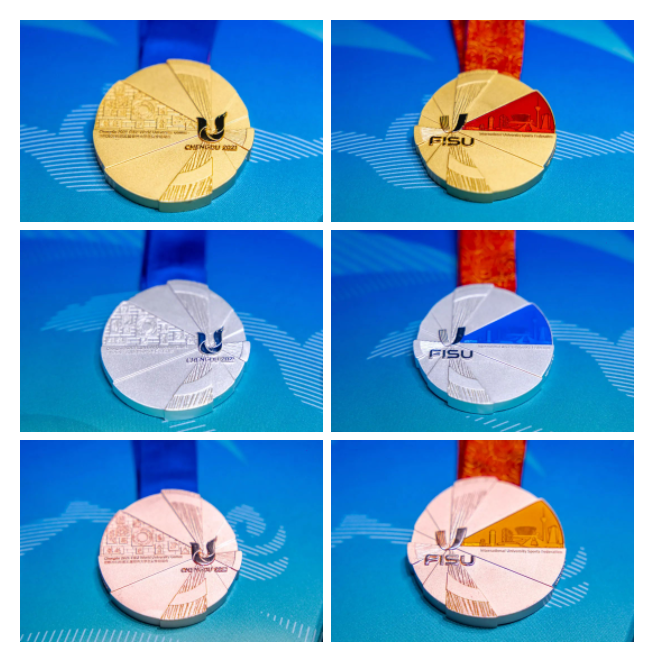成都大运会奖牌“蓉光”以成都大运会会徽和太阳神鸟为主要灵感,利用不规则的扇形呈现神鸟羽翼。奖牌背面嵌入了一块珐琅并加入成都城市建设的剪影。