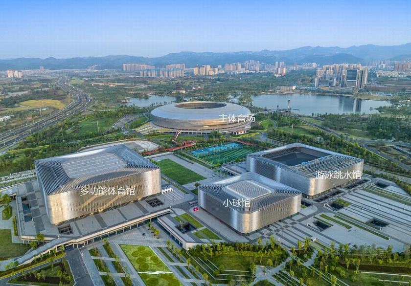 东安湖体育公园由“一场三馆”组成:主体育场、多功能体育馆、游泳跳水馆和小球馆。