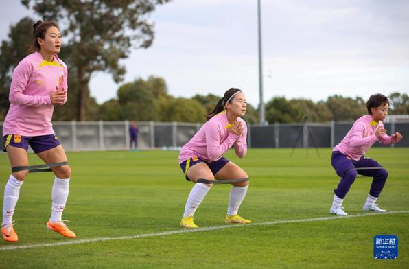 当地时间7月10日,中国国家女子足球队在澳大利亚阿德莱德进行训练,中国队球员张琳艳(右)、肖裕仪(中)和吴海燕在训练中。新华社 谢思达摄