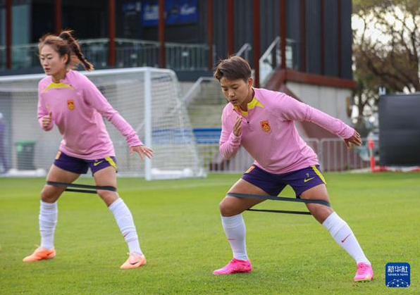当地时间7月10日,中国国家女子足球队在澳大利亚阿德莱德进行训练,中国队球员王霜(右)和吴海燕在训练中。新华社 谢思达摄