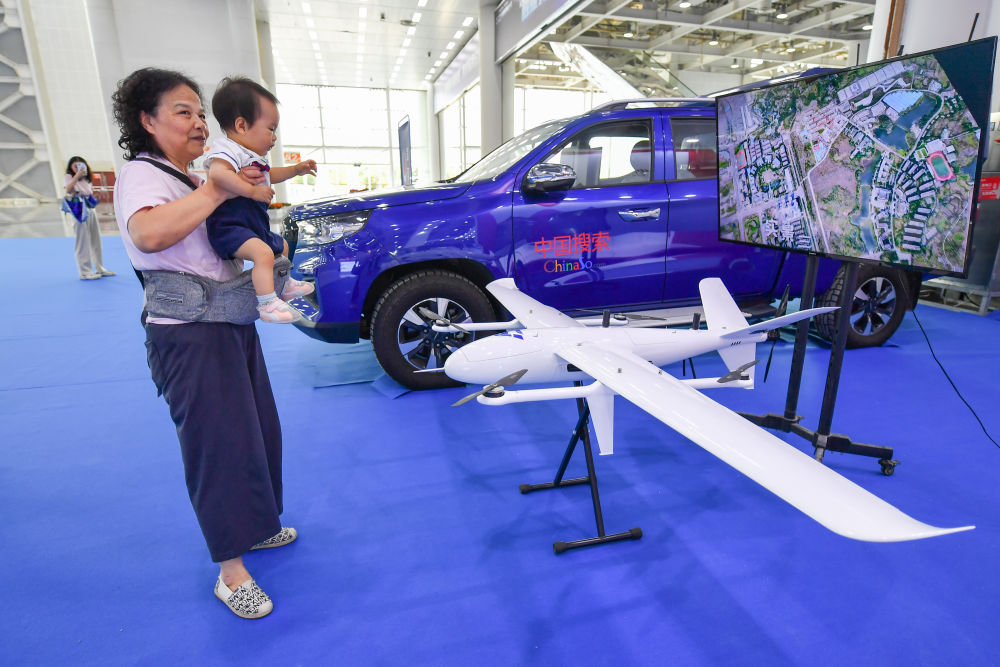 7月12日,参观者在中国新媒体技术展上参观无人机设备。新华社记者 陈泽国 摄